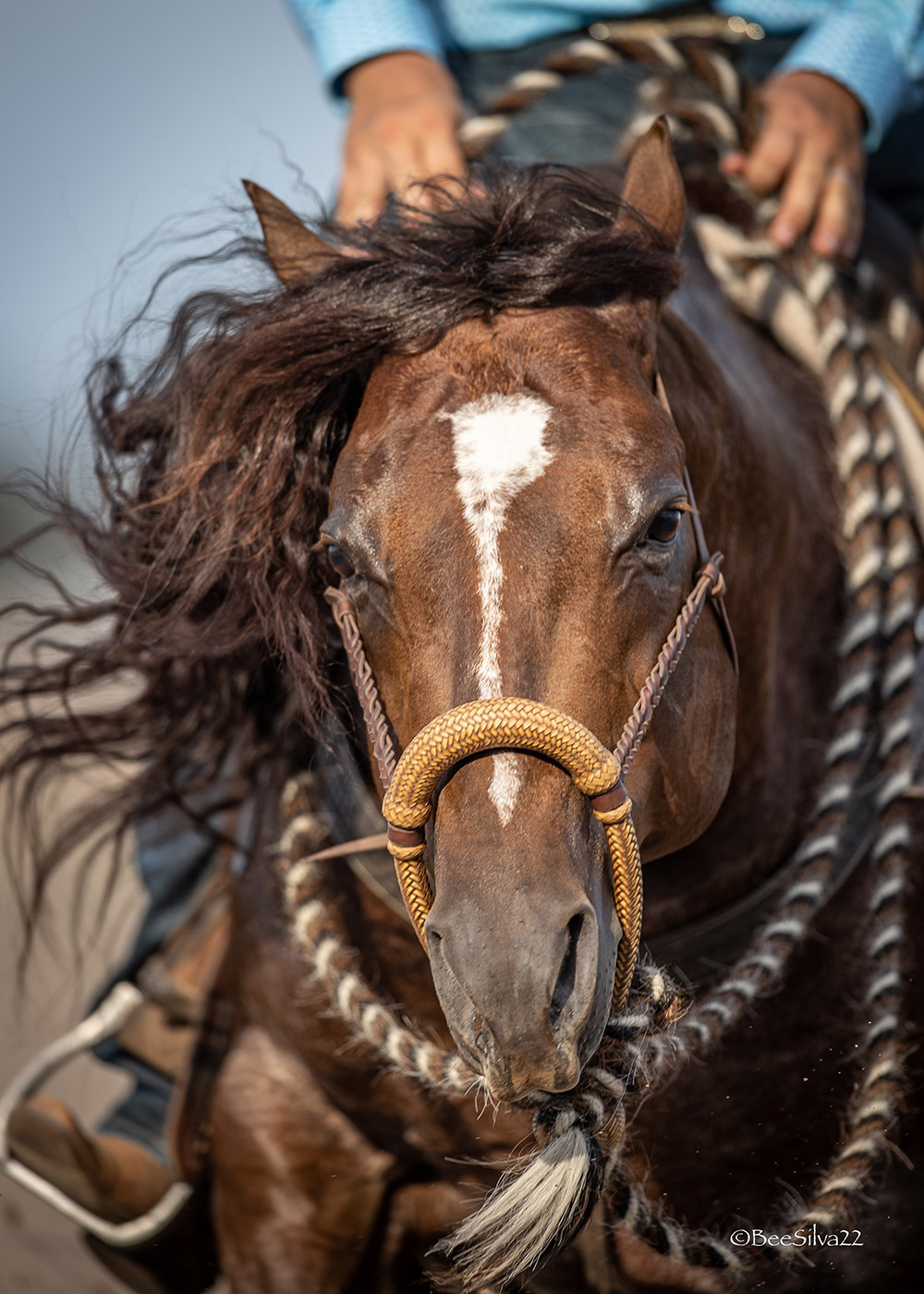 “I actually train a lot of my horses in a noseband I bought years and years ago. He is very comfortable in it and works a little better in that than in a snaffle bit, so he’s taken to the hackamore easily,” Volmer explained. “He is a little more free in it than in the snaffle to express his individuality. I go along for the ride.”